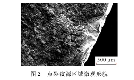 2.1.1 軸斷裂面宏觀及微觀形貌觀察 軸斷裂面處于軸上軸承安裝處的過渡圓弧區(qū)域(軸承安裝根部)。圖 1 為斷軸宏觀斷裂面,局部發(fā)生磨損,斷口表面齊整與軸向垂直,無縮頸和塑性變形痕徑。斷口疲勞條帶明顯,從外圓向中心擴(kuò)展,最終瞬斷區(qū)面積小于軸截面積的 10%,說明斷軸所受名義應(yīng)力較小。