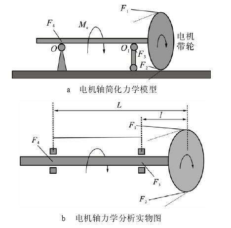 2.2 電機(jī)軸力學(xué)計(jì)算分析由于電機(jī)軸為階梯軸,不同階梯截面處承受的力矩和應(yīng)力是不同的。電機(jī)運(yùn)行時(shí)軸受到彎扭力矩的共同作用,如果某一階梯截面承受應(yīng)力過大,則可能最先在階梯截面過渡圓弧處萌發(fā)裂紋和發(fā)生斷裂,因此找出電機(jī)軸受力危險(xiǎn)截面,對(duì)判斷軸斷裂原因有重要作用。電機(jī)軸力學(xué)分析簡(jiǎn)化模型如圖 4 所示。圖中,F(xiàn)1、F2為皮帶張緊力;F3、F4為電機(jī)軸支撐力;Me為電機(jī)轉(zhuǎn)矩;O 與O1為電機(jī)軸支撐點(diǎn);F 為皮帶張緊力 F1與 F2的合力;T 為 O1支撐點(diǎn)承受的彎矩;D 為電機(jī)軸分析截面直徑;M 為分析截面對(duì)應(yīng)扭矩;L 和 l 分別為電機(jī)左端軸承距右端軸承及電機(jī)帶輪的水平距離。