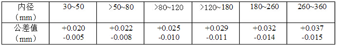 軸承與軸承室配合,其軸承套內(nèi)徑選擇公差見表二。在加工中應盡量控制在中間公差的上偏差區(qū)間內(nèi),呈間隙配合,以保證電機在額定運行中其軸貫通部分發(fā)熱時,為熱膨脹留有一定裕度。但是軸承套加工尺寸不宜過大,否則會發(fā)生跑套現(xiàn)象,軸承更容易發(fā)熱,為此在檢修中,應嚴格把住軸承內(nèi)、外徑實際配合精度,以保證軸承裝配后達到有限自由的穩(wěn)定運行狀態(tài)。