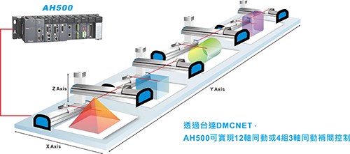 AH500的優(yōu)異運(yùn)動(dòng)控制功能,可實(shí)現(xiàn)任意三軸直線(xiàn)補(bǔ)間、任意兩軸圓弧補(bǔ)間、及任意三軸螺旋補(bǔ)間與連續(xù)補(bǔ)間功能,透過(guò)臺(tái)達(dá)DMCNET高速通訊網(wǎng)絡(luò)架構(gòu),可達(dá)到1ms的指令周期內(nèi)12軸同動(dòng)或4組3軸同動(dòng)補(bǔ)間功能。無(wú)論是復(fù)雜的過(guò)程控制或是精密的運(yùn)動(dòng)控制需求,都能透過(guò)AH500來(lái)實(shí)現(xiàn),有效應(yīng)用于各種產(chǎn)業(yè)機(jī)臺(tái),如建材機(jī),經(jīng)編機(jī),食品包裝機(jī)等等。